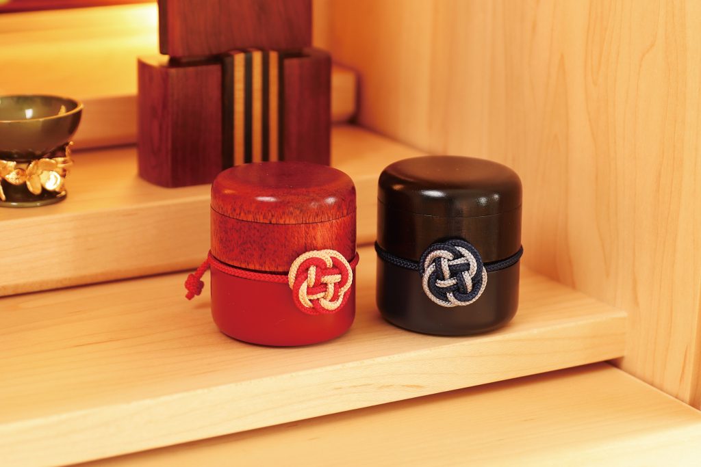 山中塗の職人が丁寧に仕上げており、ねじ式の蓋でしっかりと閉まる構造が特長です。京くみひもをあしらった上品なデザインで、身近な場所に故人を偲ぶ空間をつくることができます。